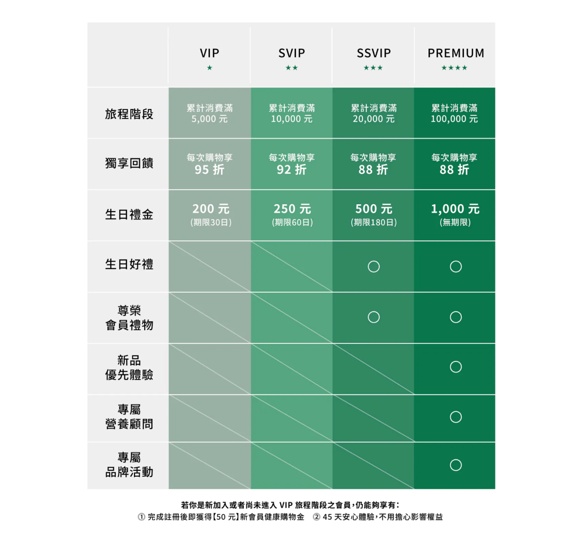 每階段的會員,享有不同的專屬回饋,從日常獨享回饋、生日驚喜小禮到 PREMIUM 會員專屬體驗,讓你的天然旅程更輕鬆。