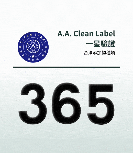 主動通過國際第三方 A.A. Clean Label 驗證,延展品質信任。A.A.(Anti Additive Clean Label Organization)為全球代表性的無添加驗證機構,依據聯合國永續發展目標(SDGs)與潔淨標章精神,逐項審核原料、製程與成品的安全與透明。