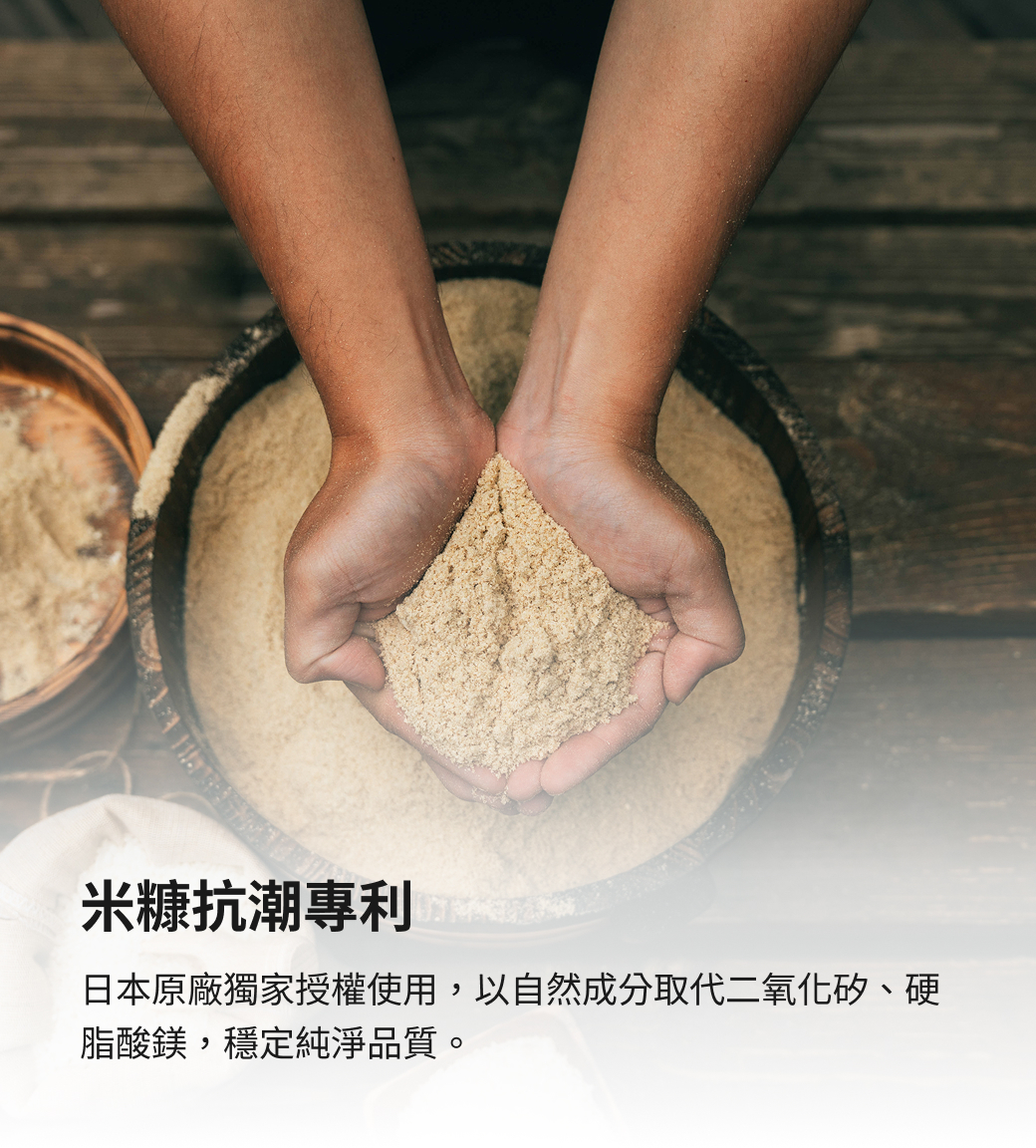 導入天然抗潮科技,以「米糠濃縮物」取代二氧化矽與硬脂酸鎂等化學添加劑,提升製程品質與安定性;以植物來源膠囊,代替動物明膠或鹿角菜膠的使用,實踐純淨原則。
