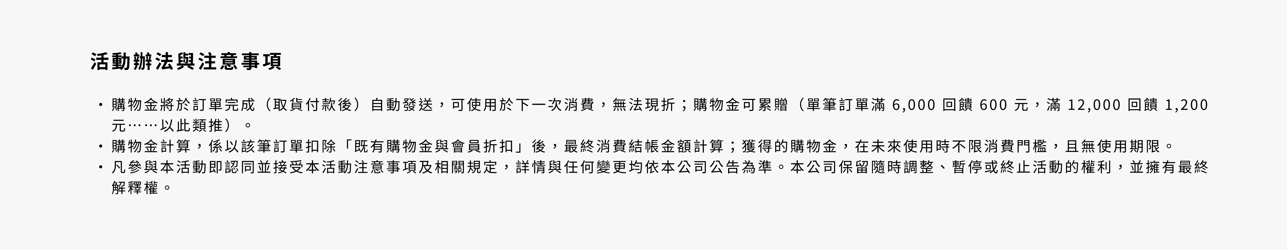 本次活動的購物金發送,會以「會員折扣」且「使用既有購物金」後,「最終的消費結帳金額」來計算。