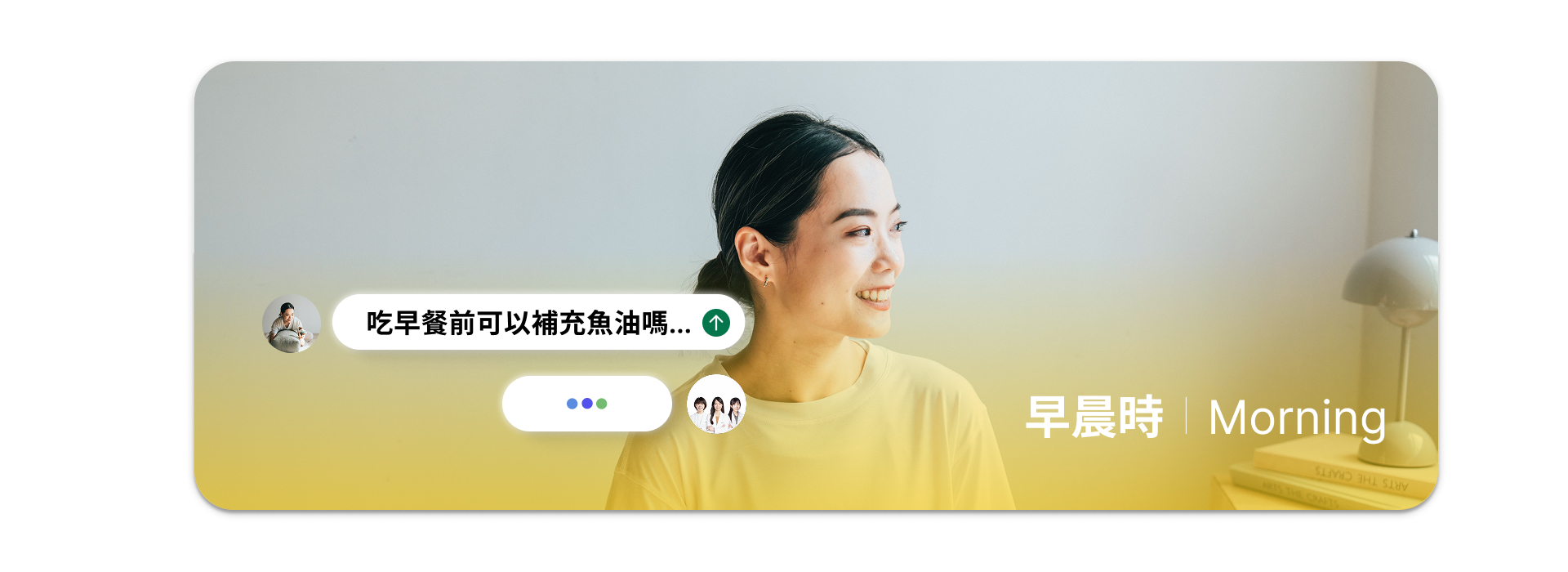 掌握身體節奏,每次的營養都恰到好處不過量。 早上睜眼、午餐後、入睡前,每個時刻,都有身體的恆定需求。AI 健康配速員讀懂這些訊號,讓每次需求不多不少,剛剛好地回應當下。