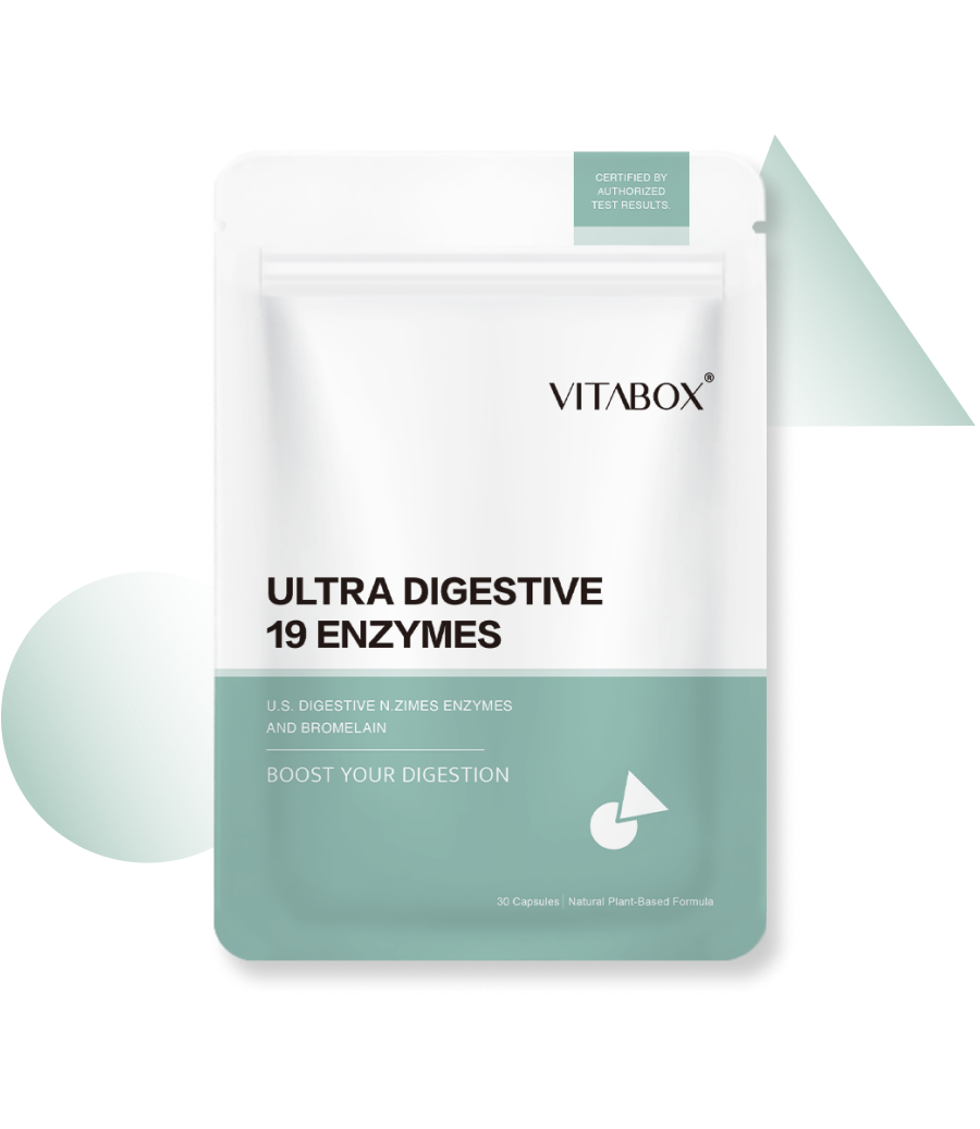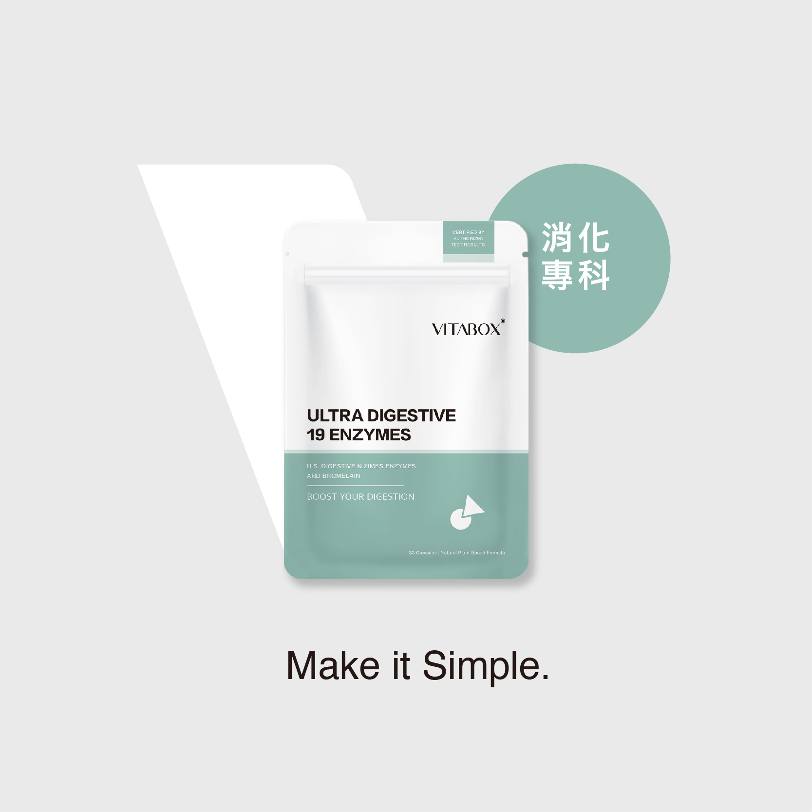 19 種消化酵素 + 鳳梨酵素,全方位幫助消化與營養吸收,並維持機能健康,無化學添加物的純淨成分,不造成代謝負擔。