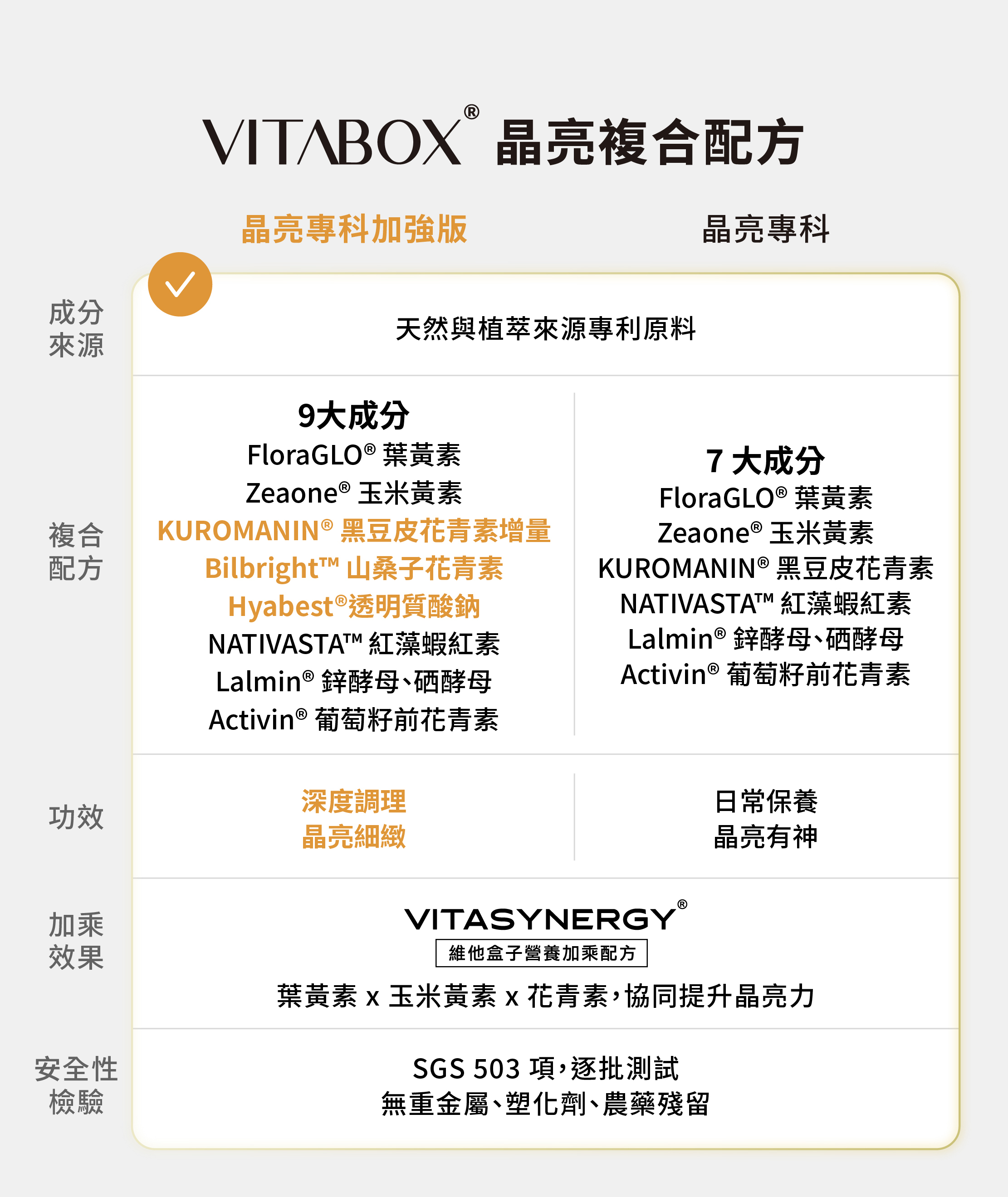 VITABOX® 專屬研製,悉心挑選天然與植萃成分,依據科研嚴謹搭配 VITASYNERGY® 營養加乘配方,並密集控管品質,保證產品的安全與效性,陪你優雅感受生活的每一瞬間。