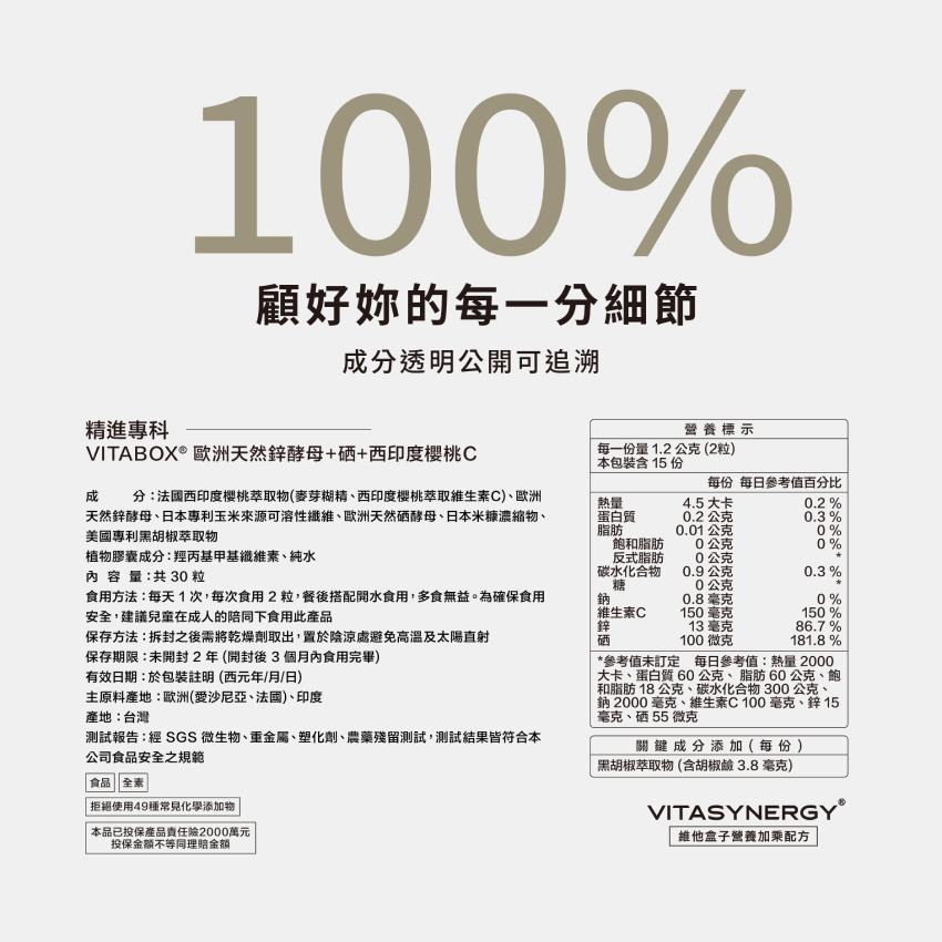 VITABOX® 所有產品均以天然無化學添加主張為導向,致力於減少化學負擔。我們投入 3 倍心力進行嚴格稽核與檢驗,並採用科學驗證的 VITASYNERGY® 營養加乘配方,確保產品的安全性與有效性。此外,每款產品均提供 45 天安心體驗 服務。